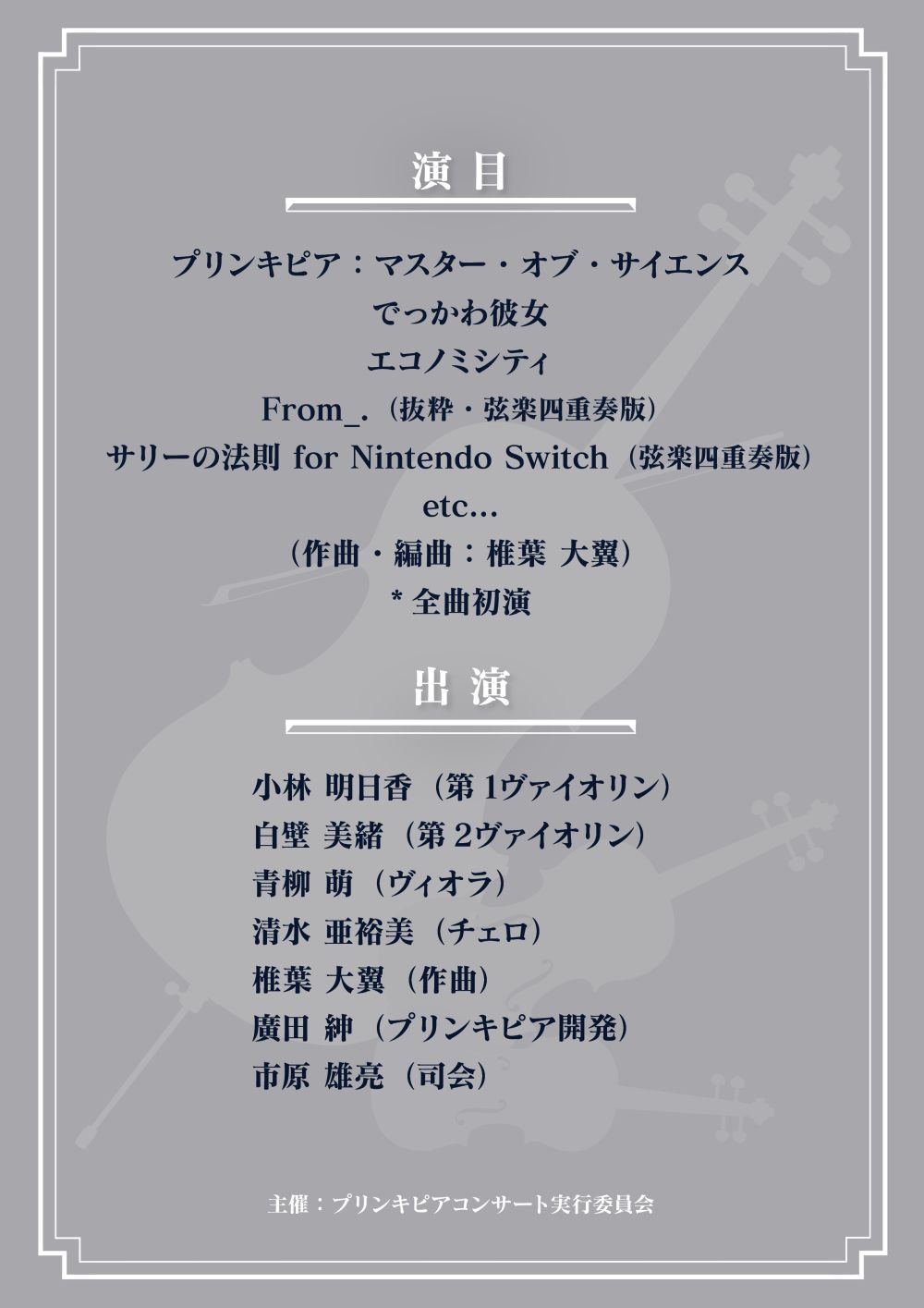 「プリンキピア」の弦楽四重奏コンサート,演目全20点が公開