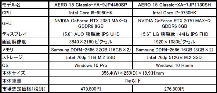 GIGABYTE,RTX 2080 Max-Q搭載の15.6型ゲームノートPCなどを発売