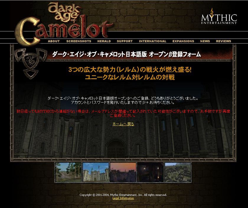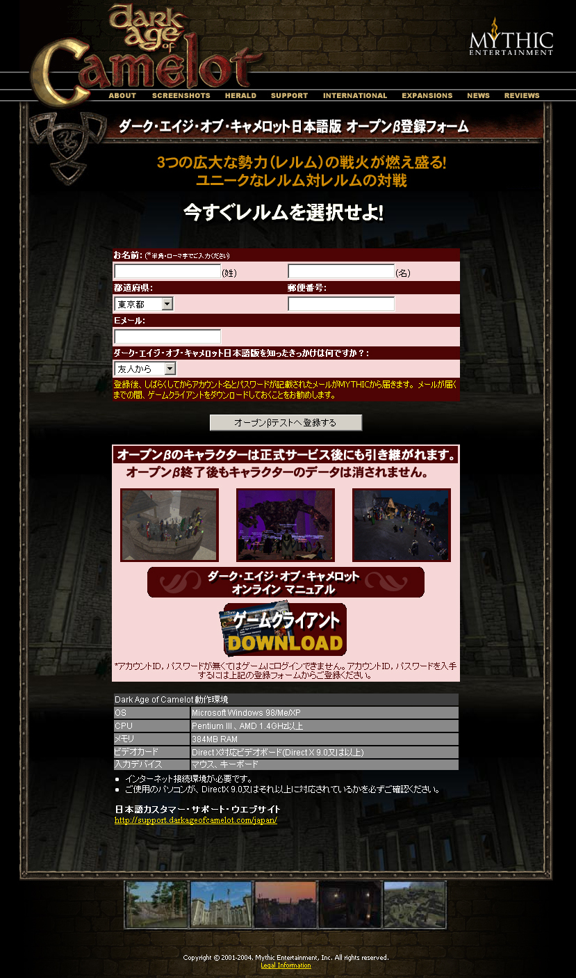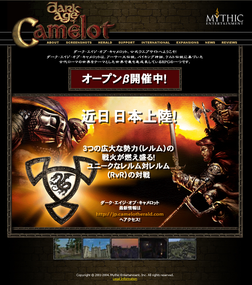 「ダーク・エイジ・オブ・キャメロット」日本語版 →公式サイトは「こちら」 →オープンβテスト応募フォームは「こちら」 →クライアントのダウンロードは「こちら」 →紹介ページは「こちら」 Copyright © 2001-2004. Mythic Entertainment, Inc. All rights reserved.